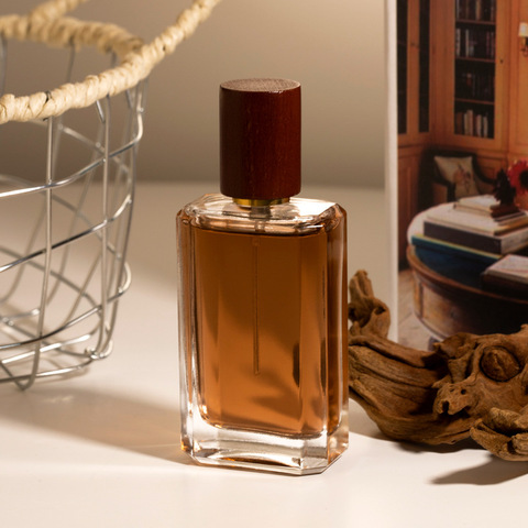 In Stock 50ml Flat Square Thick Bottom Empty Glass Perfume Bottle with Pump Sprayer Wood Cap for Cosmetics and Beauty Products